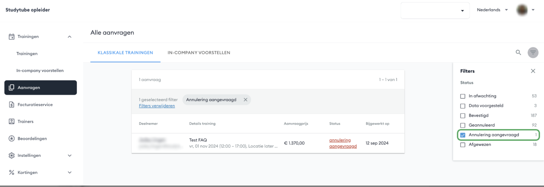 Kan je de aanvraag waarvoor de annulering is doorgevoerd niet gelijk vinden? Gebruik dan rechts de filters en selecteer 'Annulering aangevraagd':