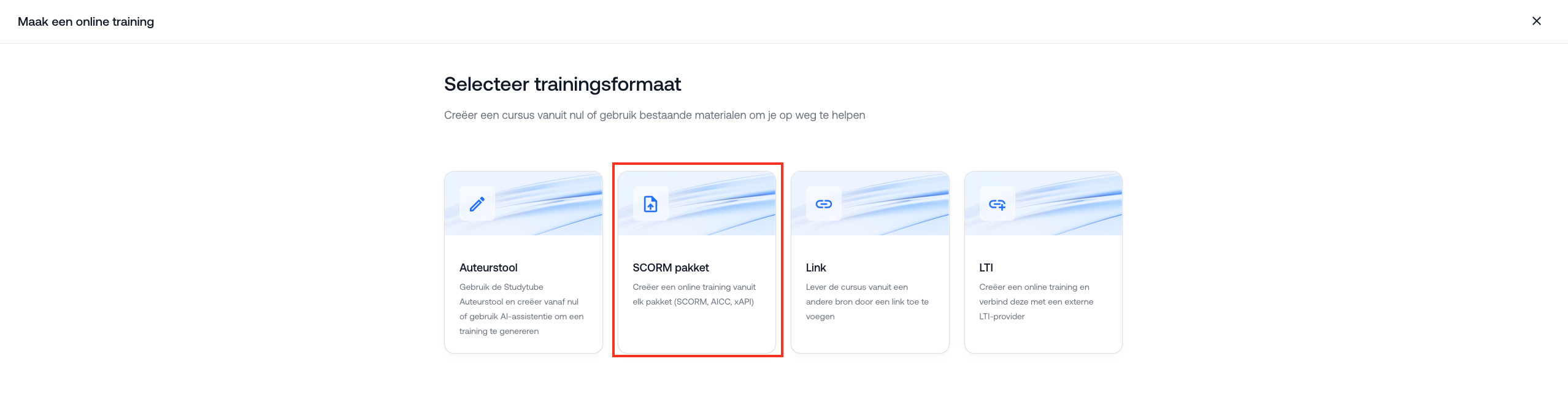 Let op: een SCORM-bestand mag maximaal 1000 MB groot zijn. Is je bestand groter? Neem dan contact op met Technical Support via service@studytube.nl.