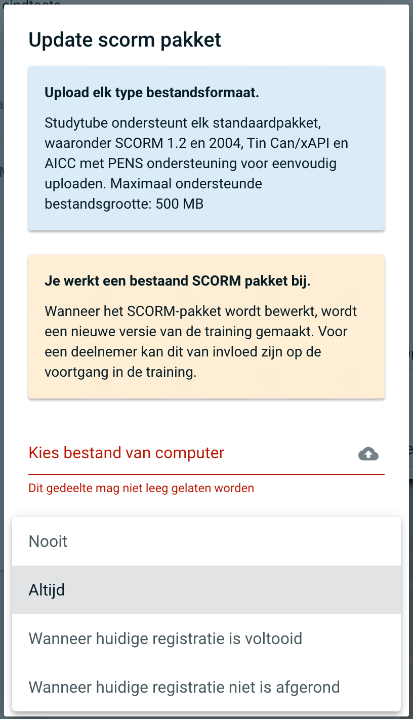 Wanneer je wijzigingen hebt aangebracht in een cursus in een externe tool, kun je het SCORM-pakket eenvoudig bijwerken in Studytube. Zo blijft je content altijd actueel voor je medewerkers.