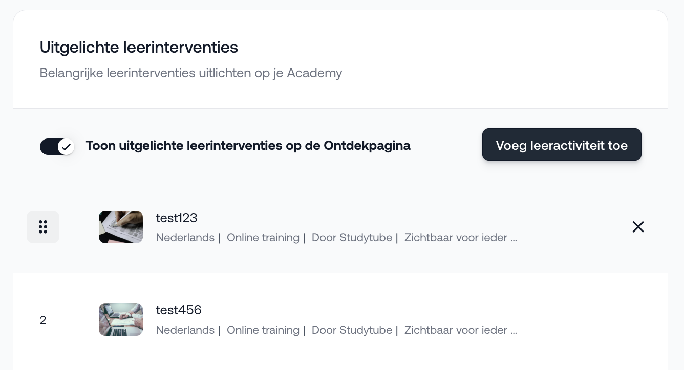 Hier is het mogelijk om 1 of meerdere leerinterventies toe te voegen die getoond zullen worden op de ontdekpagina.