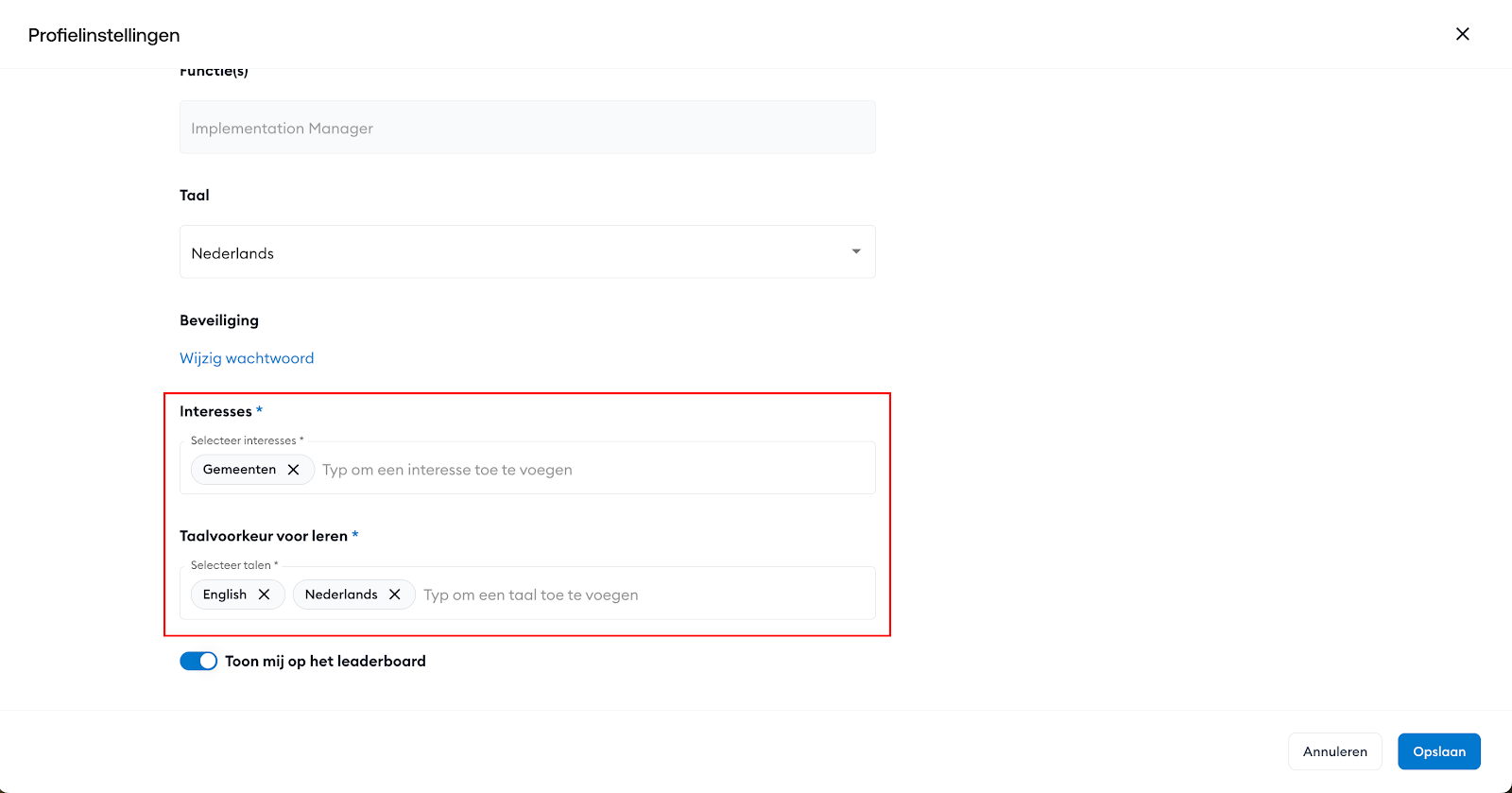 Ja. Medewerkers kunnen hun interessegebieden en voorkeurstalen op elk moment wijzigen via: