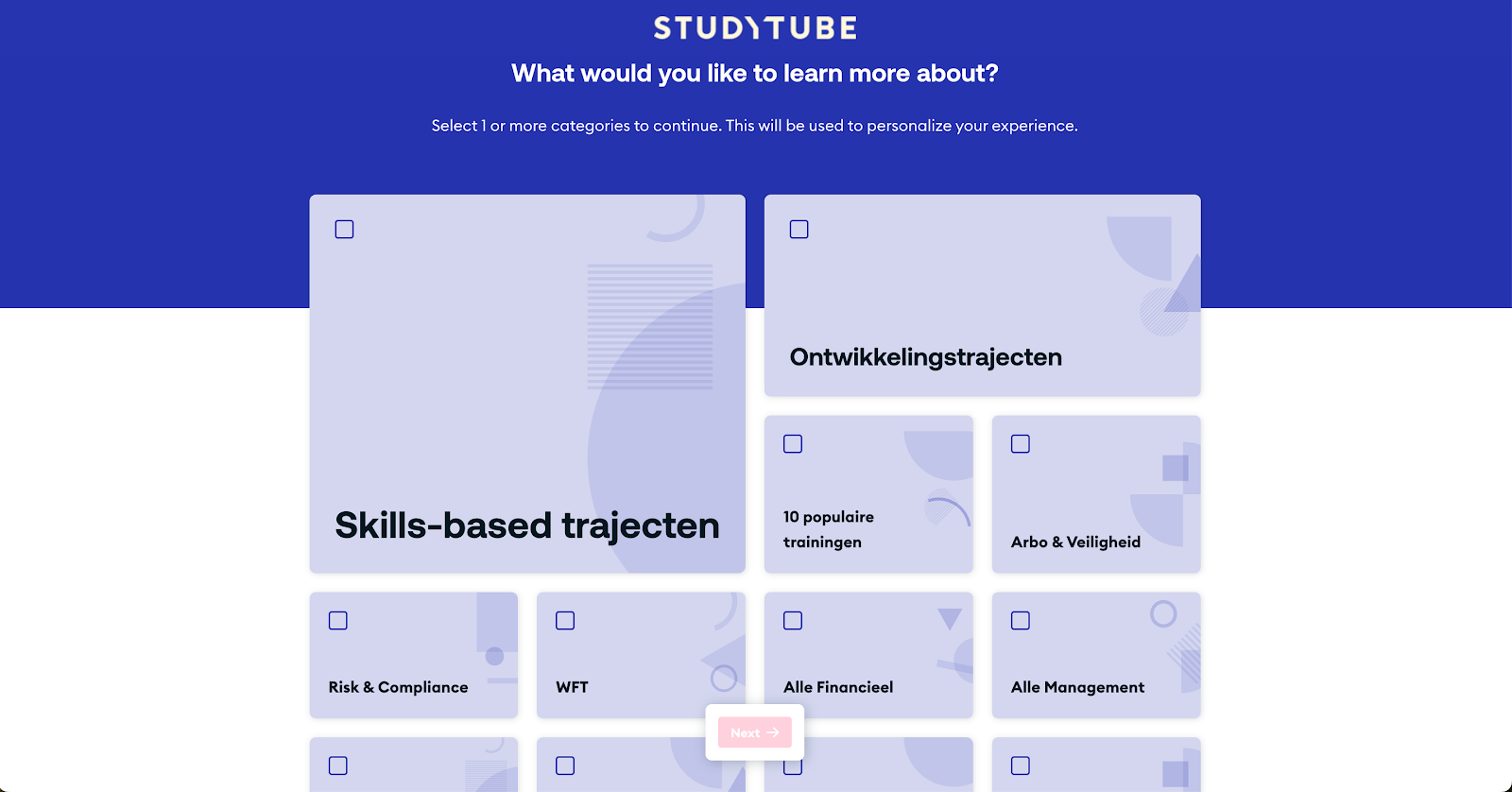 Medewerkers kiezen één of meer interessegebieden. Deze komen overeen met de categorieën die jullie hebben aangemaakt in het LMS. De gekozen interesses bepalen welke trainingen op de ontdekpagina worden getoond.