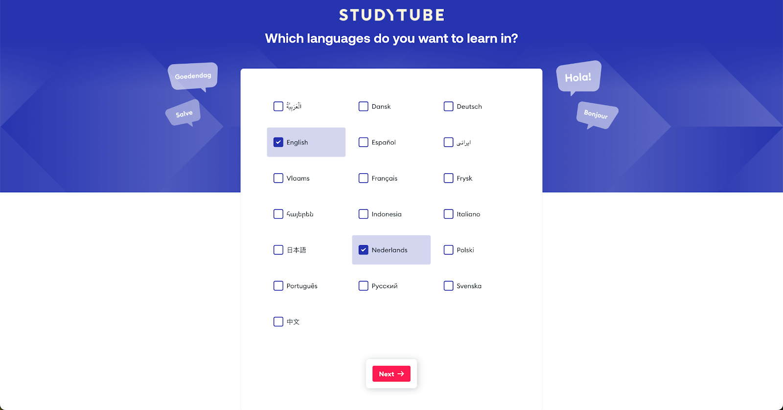 In het tweede scherm kiest de medewerker één of meerdere voorkeurstalen. Dit heeft invloed op de volgorde van zoekresultaten. Content in voorkeurstalen wordt hoger getoond, maar alle beschikbare content blijft zichtbaar in de bibliotheek.