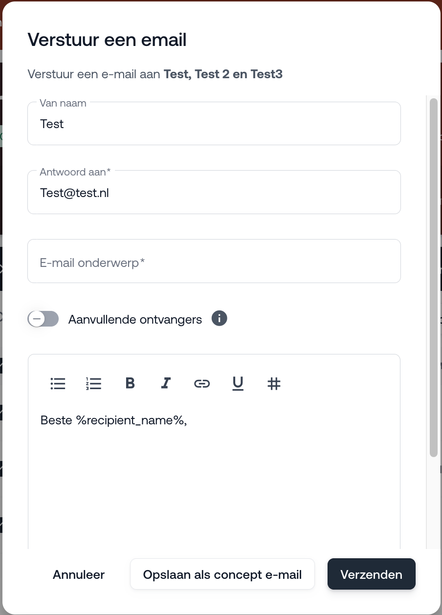 Kies de gebruikers aan wie je de e-mail wilt sturen. Je kunt meerdere personen tegelijk selecteren.Voeg aanvullende ontvangers toe (optioneel)