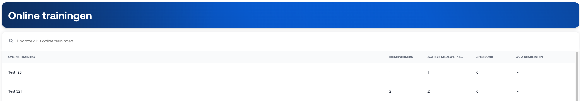 Zo krijg je in één oogopslag inzicht in de status en voortgang van alle online trainingen.