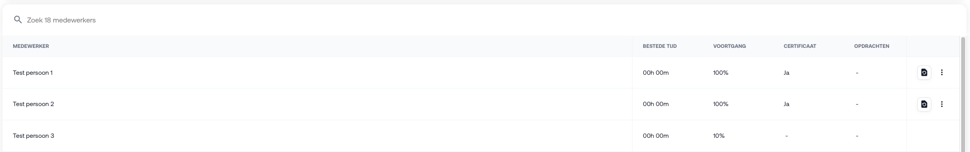 Deze rapportage helpt je om snel inzicht te krijgen in de voortgang van medewerkers per training.