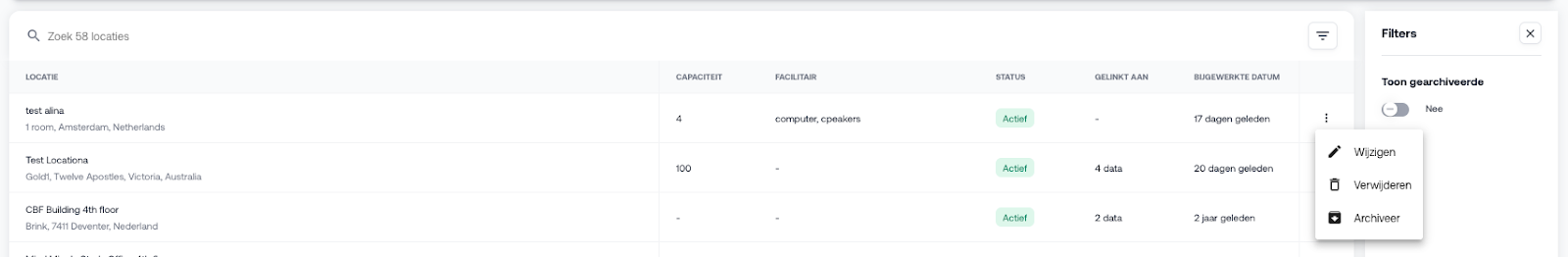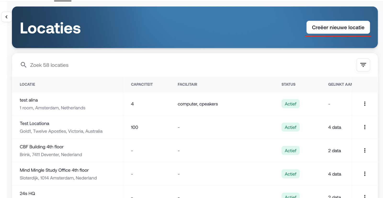 Op de overzichtspagina van locaties zie je per ruimte: