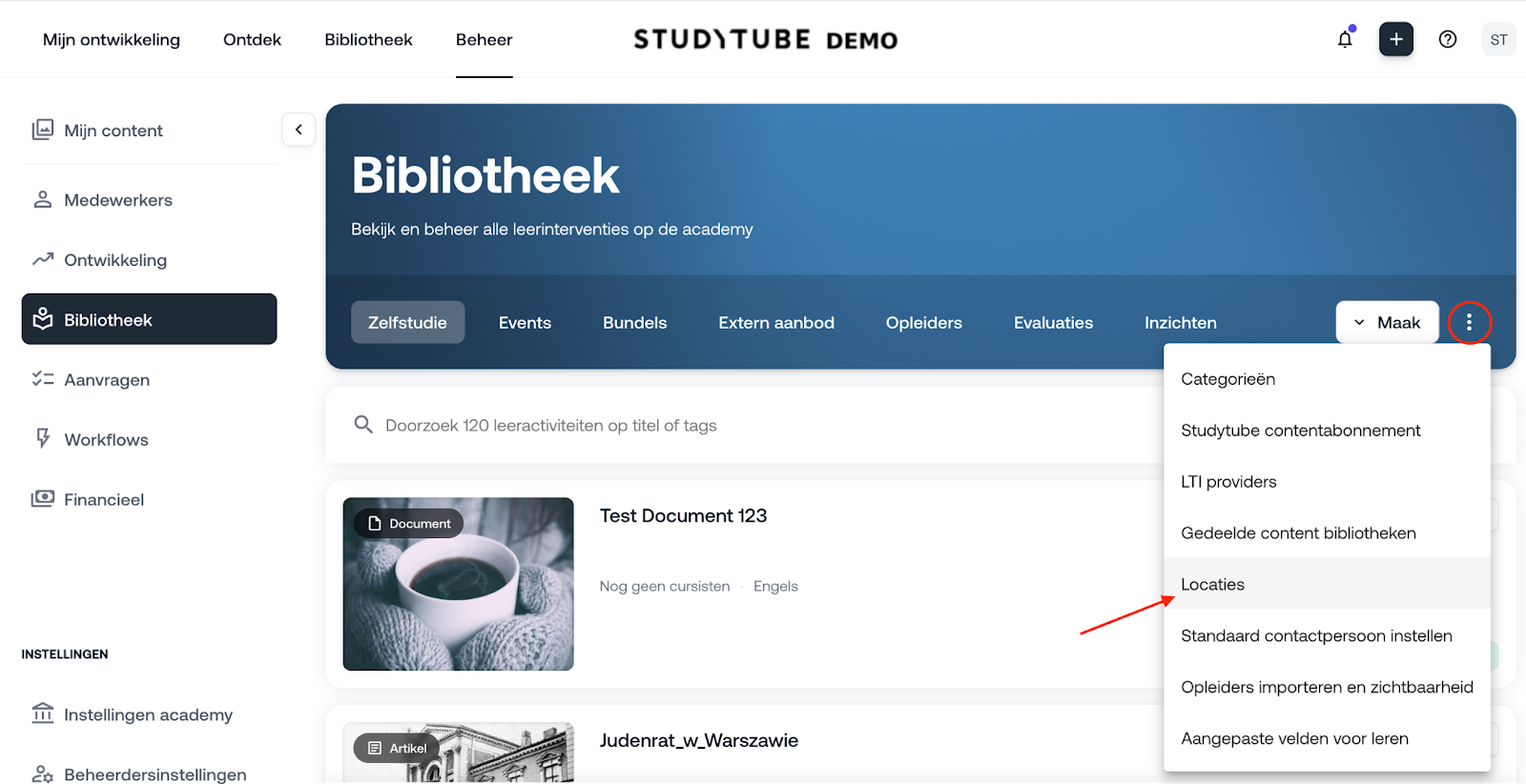 Ga in het LMS naar Bibliotheek > klik op de drie puntjes -> Locaties.